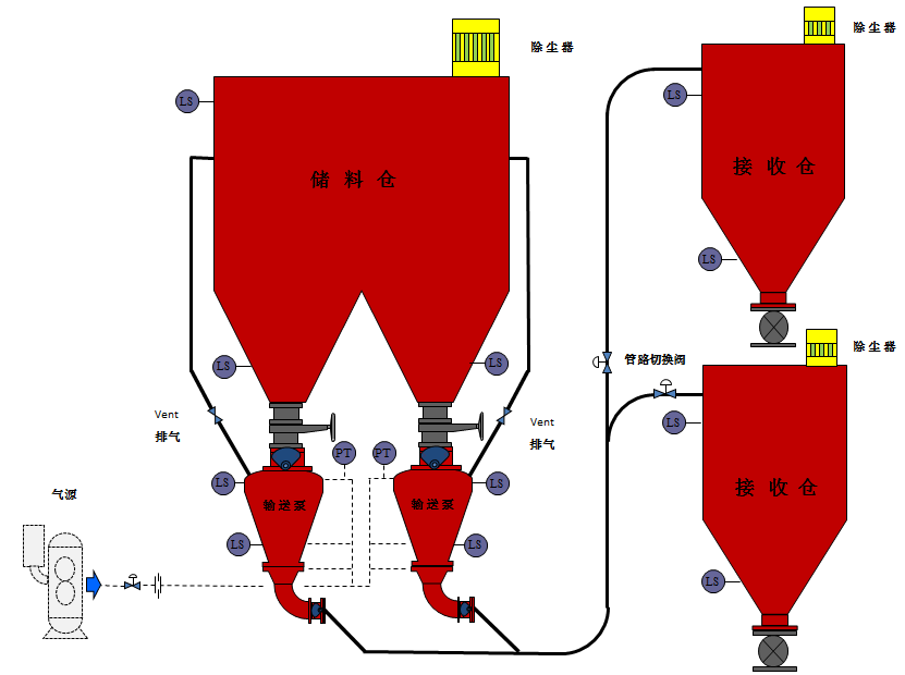 氣力輸送的主要特點是輸送量大,輸送距離長,輸送速度較高;能在一處裝料,然后在多處卸料。